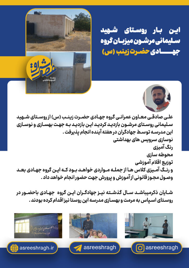 علی صادقی معاون عمرانی گروه جهادی حضرت زینب س از روستای شهید سلیمانی روستای مرشون بازدید کردید این بازدید به جهت بهسازی و نوسازی این مدرسه توسط جهادگران در هفته آینده انجام پذیرفت